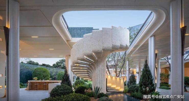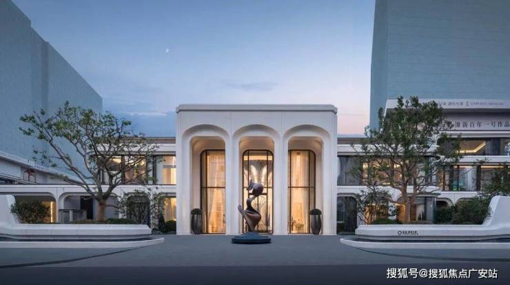 绿城没有简单照搬,而是进行艺术化提纯:溯源金贝尔美术馆的优雅拱形线条,增加序列感与仪式感;萃取“三心拱”的构图,融入建筑基座;更打造了专属的“孔雀门廊”,形成富有韵律的空间序列,成为北外滩新的建筑美学符号。