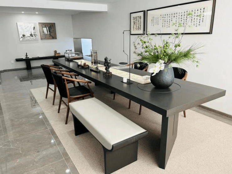 再加上香槟色木纹铝板和银色金属线条搭配,宽大的挑檐与大面积玻璃的高级运用,利落的横向线条让溪揽星院兼具现代感和古典美。