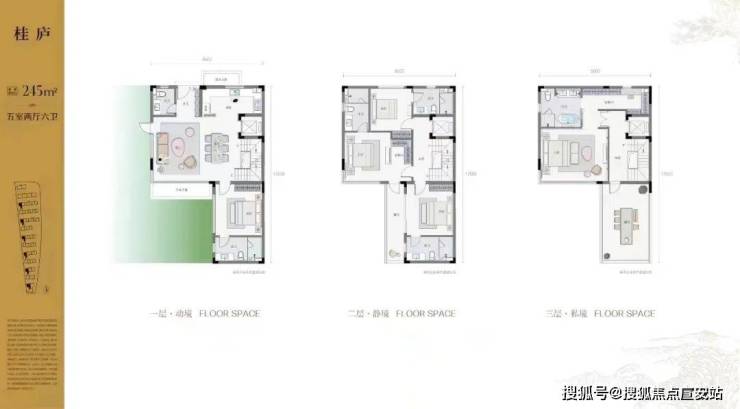 建面约245方的江山合院,整体5室2厅6卫。L型围合出私密独享内庭院;南向超大面宽更是超过了17米。为了追求即时采光面和开阔的观景视野,设计团队落地打造了270度环幕全景窗设计,自此在室内便可将一园四季美景尽收眼底。