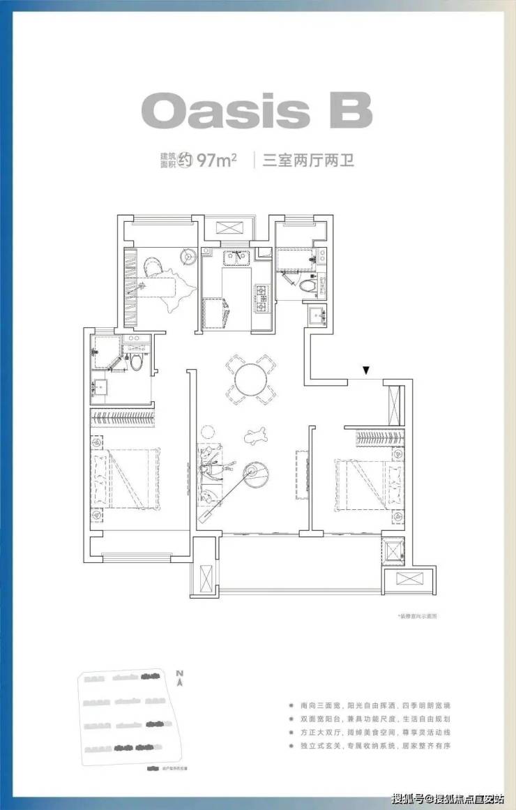 建面约97㎡三室两厅两卫设计,独立入户玄关,兼具收纳与隐蔽作用。三开间朝南,主卧套房设计,私密性较强。南向次卧与宽景阳台相连,一边用于瞰景,一边用于晾晒。