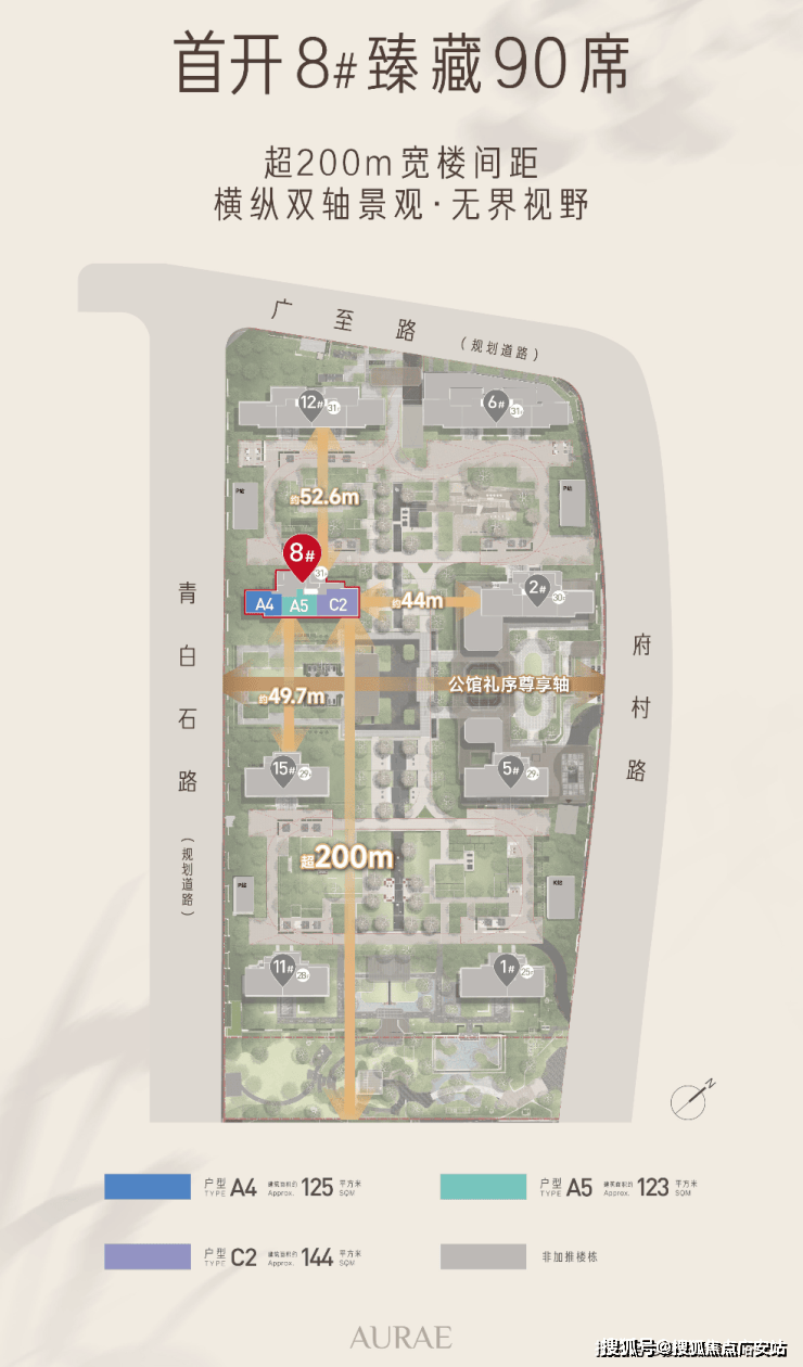 首开楼栋确认,将推出8 #楼王 ,双轴景观环绕,享超阔楼间距最长约200m,建面约123-125-144平王牌户型即将过会。