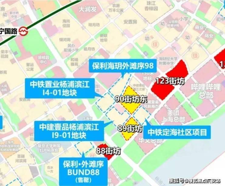 在杨浦滨江版九宫格中,主要是高端住宅+1块风貌商办,而紧邻九宫格的四至方位可以看到: