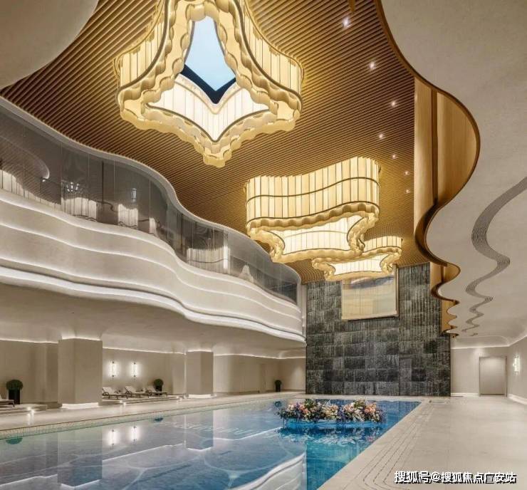 光,作为珍贵的自然馈赠,在恒温泳池区被演绎到极致。10米垂直挑空下,三处天窗精心布局,两处引入真实天光,另一处则通过感光系统模拟不同时段的自然光线。光影随时辰流转,在水面上勾勒出动态的波纹,与正前方的垂直瀑布形成虚实呼应。休息区,则以浮岛为意象,被流水环绕,与25米长、11米宽奢阔尺度的泳池共同在室内构筑出一片自然滨水秘境。