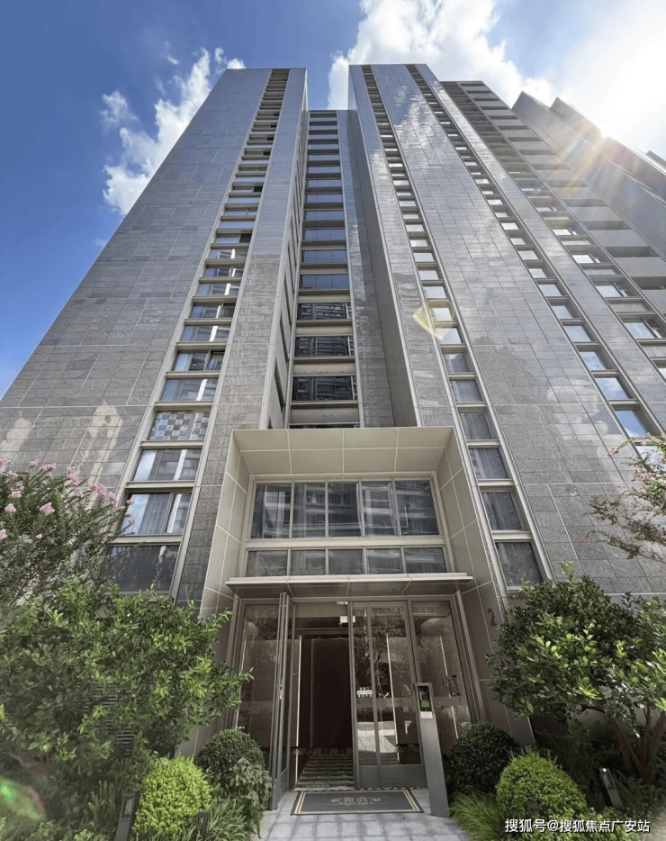 立面材料选取稍显沉稳的“皇室啡”花岗岩,其特殊的颜色与纹理,既能与北侧的办公统一色调风格,也能和周边现有的高容积率建筑,以及绿树成荫的街道环境融为一体,呈现低调精致、简洁大方的高品质住宅形象。