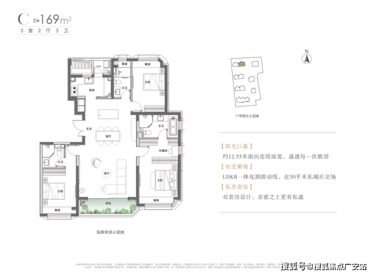 目前开放的是建面约101㎡3房和约169㎡3房两个样板间,直接来看101㎡现场实拍。