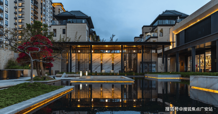 中心水景区结合风雨连廊;主入口设置跌水景墙,烘托静谧舒适的休闲氛围;水中休闲平台以及下沉式休闲区营造多样的休闲活动空间。
