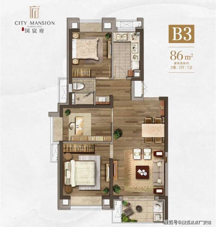 高层:建面约86平,三房二厅一卫