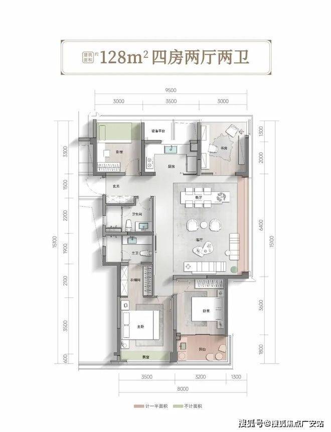 南向主卧带走入衣帽间,南向次卧带270°采光与观景视野阳台,甚至北向两个房间开间均达约3米,通常这些是很多在售140㎡以上户型才有的房间尺度感。这款128㎡户型。