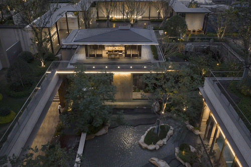 三进庭院雨打芭蕉,檐语时光。四进沉浸式下沉式会所以高山流水为幕,通过层叠水景与立体山石,复现《溪山行旅图》觅得知音的沉浸场景。