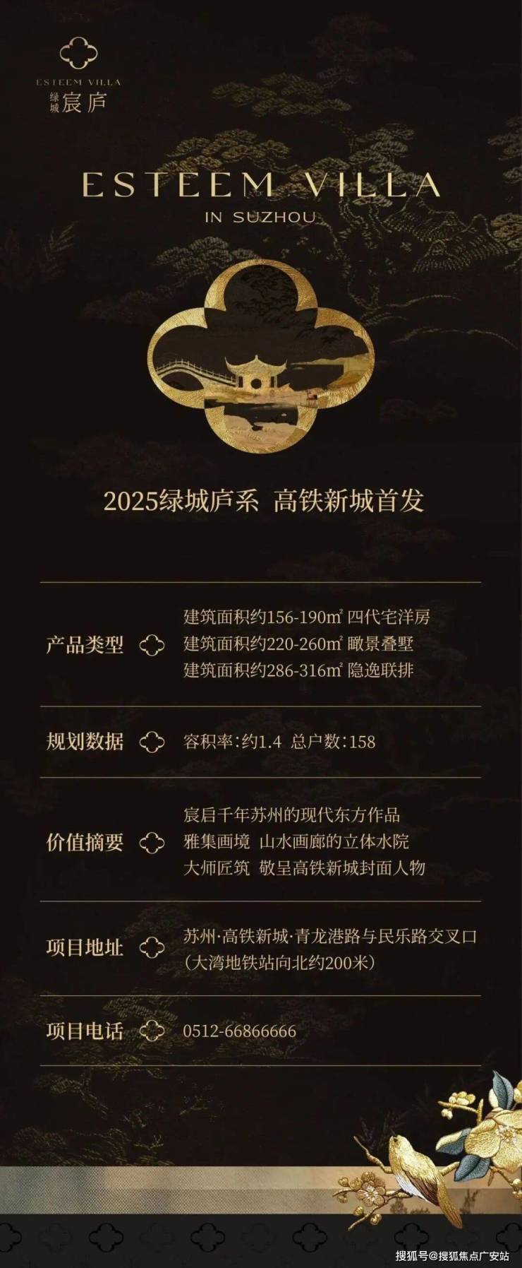 参数详情项目名称绿城・宸庐(备案名:锦庐)开发商苏州宏相城市建设发展有限公司(绿城管理受托管理)位置苏州市相城区高铁新城民乐路东、陶村街北(地铁2号线大湾站北侧约200米)产权年限70年住宅产权规划占地约2.4万方,总建面约5.76万方,12栋低密住宅(7栋3F联排、3栋5+1F叠墅、2栋11F四代洋房),总户数158户,车位比1:1.8容积率1.4(高铁新城十年稀缺低密)绿化率37%开盘/在售2025年12月11日首开,持续在售交付时间预计2027年6-9月物业费待定(绿城物业服务)交付标准四代洋房精装交付(装标≥2000元/㎡,含三大件),叠墅/联排毛坯交付核心特色低密1.4容积率、地铁口200米、四代住宅设计、绿城品质、高铁新城核心区位