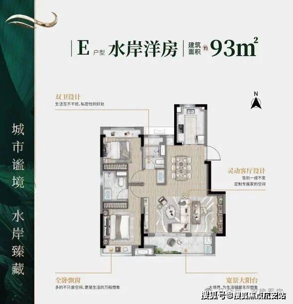 本案采用双景观轴线设计,让业主尊享臻境归家礼遇和隐归自然体验,悦享惬意生活。产品方面,建筑面积约122㎡的水岸联排别墅和56-70-93-127㎡水岸洋房产品搭配,满足不同业主居住体验需求。其中E户型和F户型水岸洋房更是采用大牌精装交付,赋能品质生活。