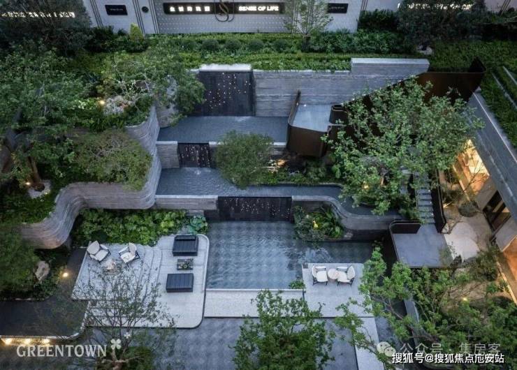“层林叠院”解构弗兰克·劳埃德·赖特“流水别墅”精髓,三阶跌水倾泻而下。台地花园有序排布,红枫、斜飘紫薇等绿植营造四季景致。阶梯步道、休憩空间巧妙设置,景随人移,随自然渐入沉浸。