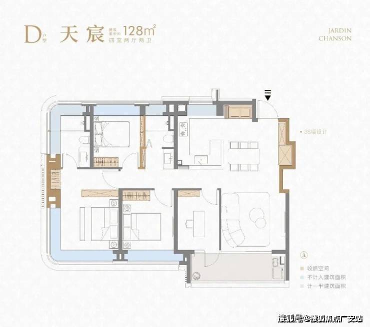 延续了3S墙和双270°全景双舱的亮点,尺度感进一步提升。南向四开间保证了更充沛的阳光,客餐厅与超大尺度阳台贯穿南北,进门视野无遮挡,大宅气度油然而生。
