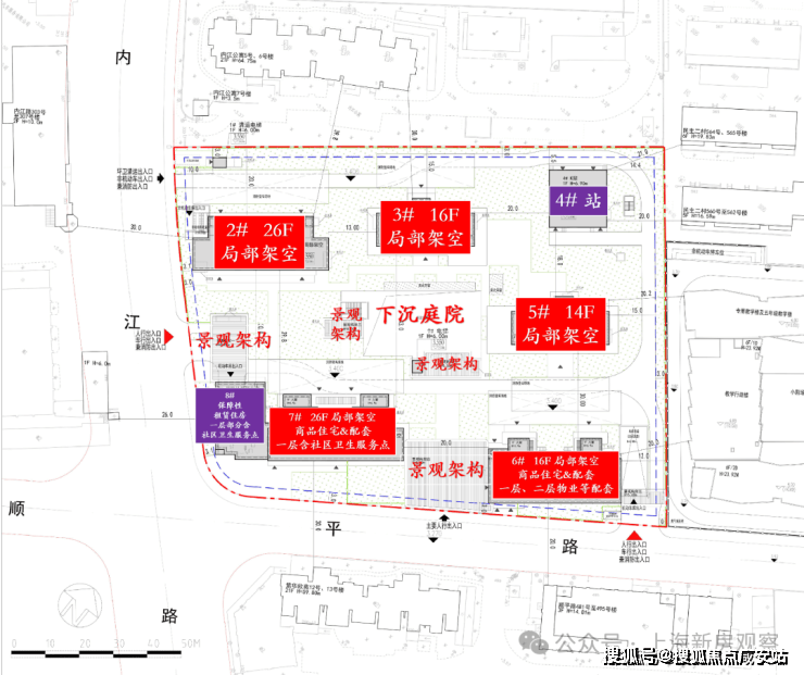 根据规划图所知,项目拟建5栋14-26F住宅产品,以及1栋保障性租赁用房;2# 楼为26层高层,3# 楼为16层小高层,5# 楼为14层小高层,6# 楼为16层小高层,7# 楼为26层高层;8# 楼为8层保障性租赁住房;