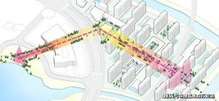 开放共享轴链接各个节点:生态运动休闲带,生态林荫大道,街区绿地;形成连续的绿色公共、半公共空间。并在绿地中注入国际文化特点的商业配套,形成尺度宜人的街道和建筑尺度。