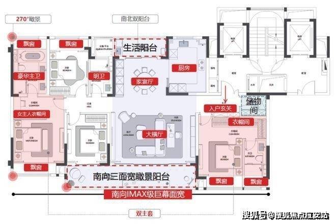 大横厅与双联阳台:宽敞的大横厅连接双联阳台,不仅拓宽了室内空间,还提供了极佳的观景体验.