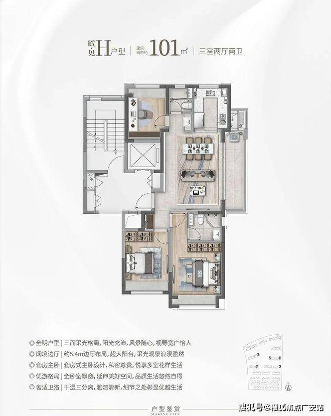 H户型:瞰·见 建筑面积约101㎡,三房两厅两卫