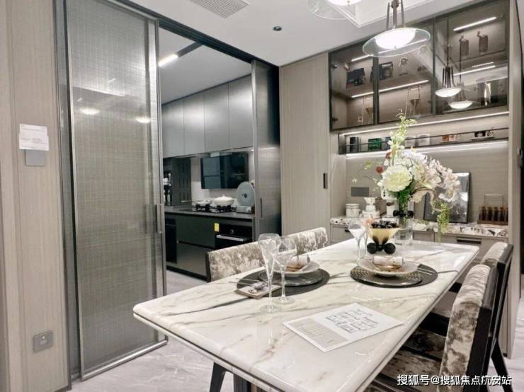 餐厅区域放置一个餐边柜,同样选用了雪山飞狐奢石做透光台面设计,餐边柜在收纳储物方面具有显著作用。