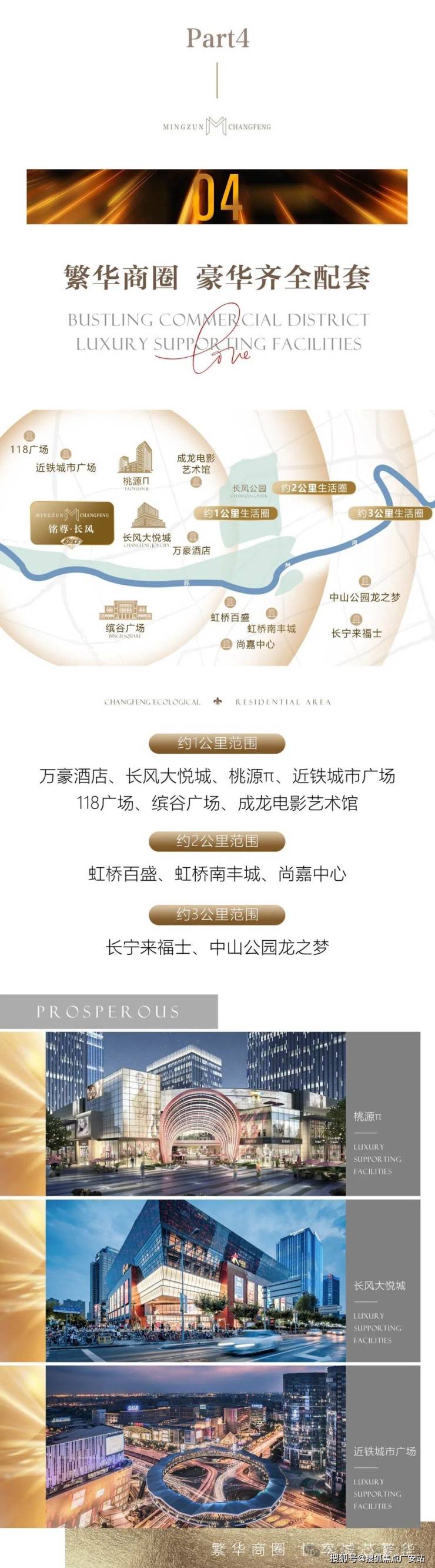 商业配套齐全:1公里范围内有万豪酒店、万怡酒店、近铁城市广场、118广场、缤谷广场、成龙电影艺术馆、长风大悦城;2公里有巴黎春天百货;3公里有长宁来福士、中山公园龙之梦。