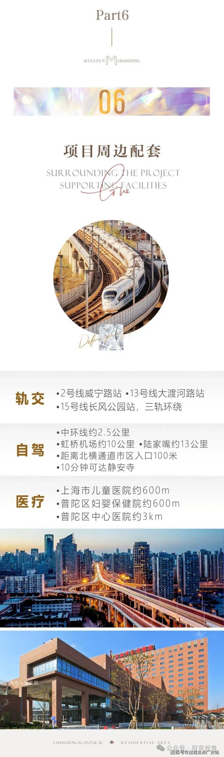 三轨环绕交通:地铁2号线威宁路站、13号线大渡河路站、15号线长风公园站均约1.2公里,中环线约2.5公里,虹桥机场约10公里,陆家嘴约13公里,形成便捷立体交通网络。