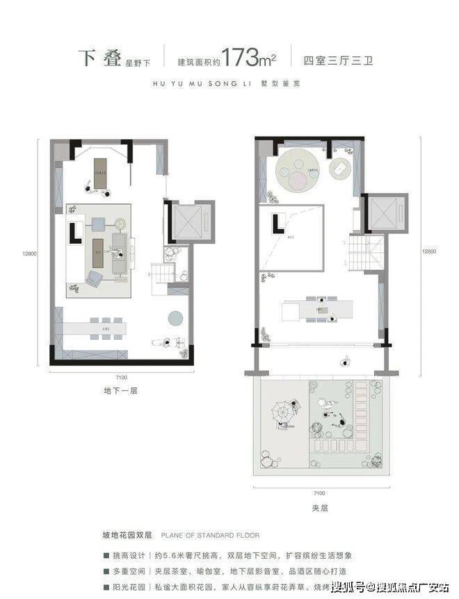 可以非常明显的看出,项目是做了双首层的概念。因为特殊的坡地处理,所以有天然的地理高差,地下层与一层自然贯通,形成两个首层,使原有“地下层”跃然平面之上,成为稀有的“阳光院落层”。