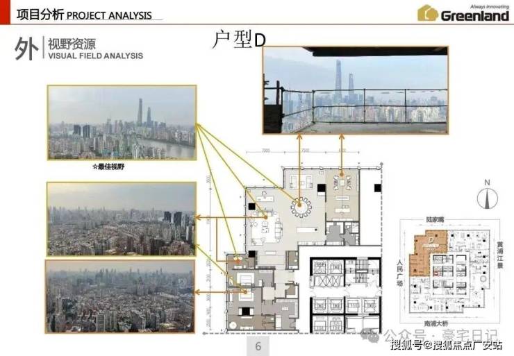 本案北视角:陆家嘴、北外滩;西视角:人民广场、新天地;东视角:浦东、黄浦江;南视角:南浦大桥、世博园。