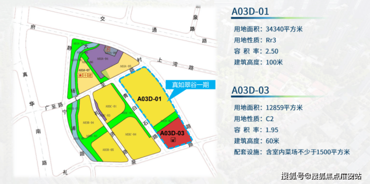 A03D-01地块:出让土地面积34340平方米,土地用途为普通商品房,规划容积率2.5,计容建筑面积85850平方米。