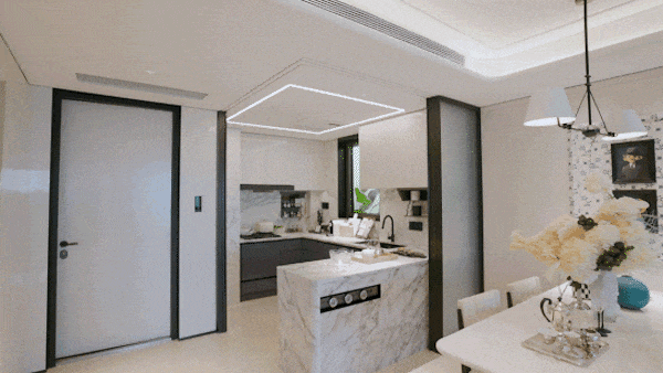 主人在U型高效厨房忙碌,转身就能加入客厅的谈天说地,灶台的烟火气,瞬间化作亲情的暖流。环幕视野的阳台,是清晨咖啡的观景台,也是孩子眺望星空的瞭望塔。烹饪、会客、观景、亲子…生活场景在此自由切换,无缝交融。