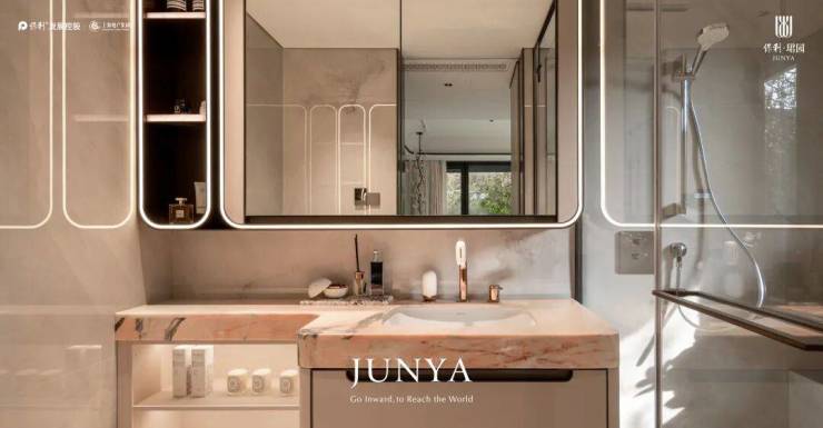 在主卫空间,珺园专为女主人量身打造完整美妆奢护体系,女神六件套涵盖科勒玫瑰金美妆龙头、美妆镜柜、顶置双补光照明、专属美妆冰箱、奥普美妆浴霸及进口胭粉奢石台面,精准适配女性日常梳妆、护肤、美妆的全场景需求,让每一次美妆都是一场专属仪式感体验