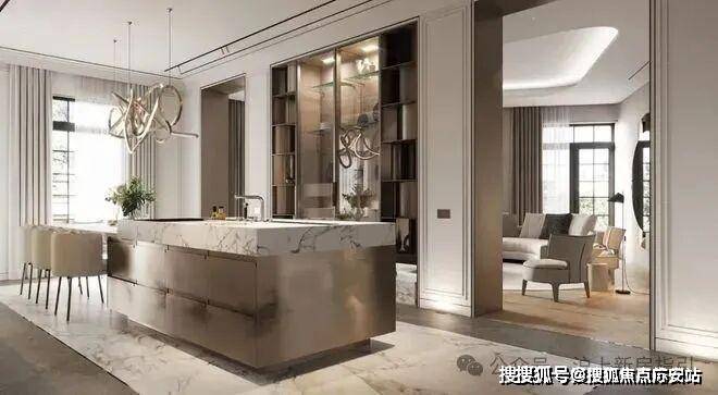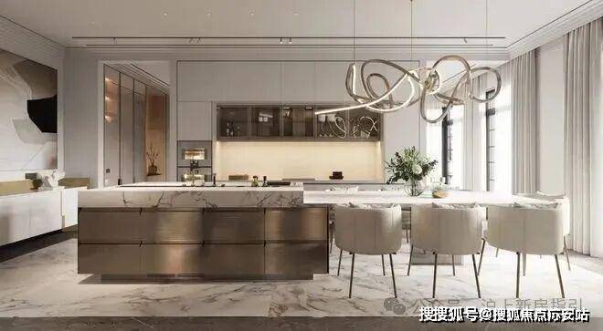 未来港元启售楼处电话:400-9692-958在厨房的设计中依然沿袭客厅的设计采用大理石元素,通过金属元素与大理石元素的结合来表现空间的轻奢,其中金属的岛台加上大理石台面让空间极具氛围感,让空间看上去更有层次。未来港元启售楼处电话:400-9692-958