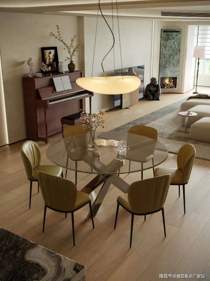 圆形餐桌的选择打破了直线的刻板感,水吧去方形的吧台,方圆的组合通过优化高度、融合材质与结构美学,将烹饪区升级,让整个环境充满温度。