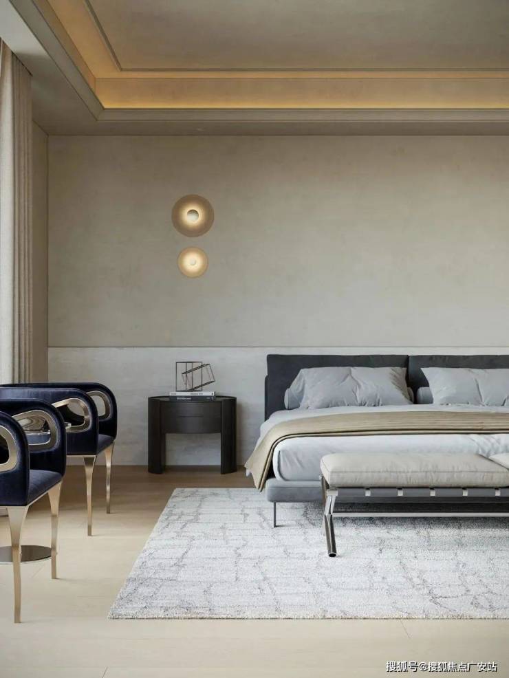 主卧的空间设计简单,最简单的家具需求,摒弃繁复装饰与色彩堆砌,大量的留白,低饱和的色调营造温馨安静的睡眠空间。