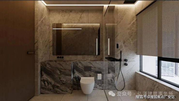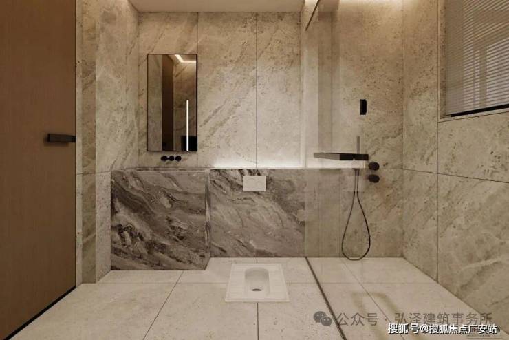以大理石为主材,打造奢华质感。淋浴区与方便区分离,提升使用效率,镜柜增加储物空间。