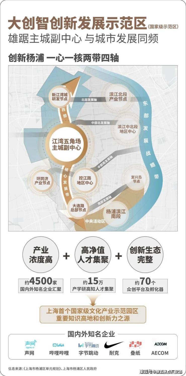 江湾五角场和新江湾城共同构建了大创智创新发展示范区。形成了世界级的产业集群,是“产业浓度、人才浓度、创新生态” 兼具的创新功能聚集区。