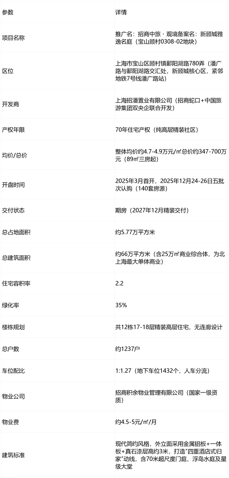 核心定位:招商蛇口与中国旅游集团双央企联袂打造的宝山顾村TOD综合体标杆,12栋17-18层精装高层,主打约89-144㎡3-4房,均价约4.7-4.9万元/㎡,总价约347-700万元,适配刚需至品质改善家庭,2027年12月精装交付