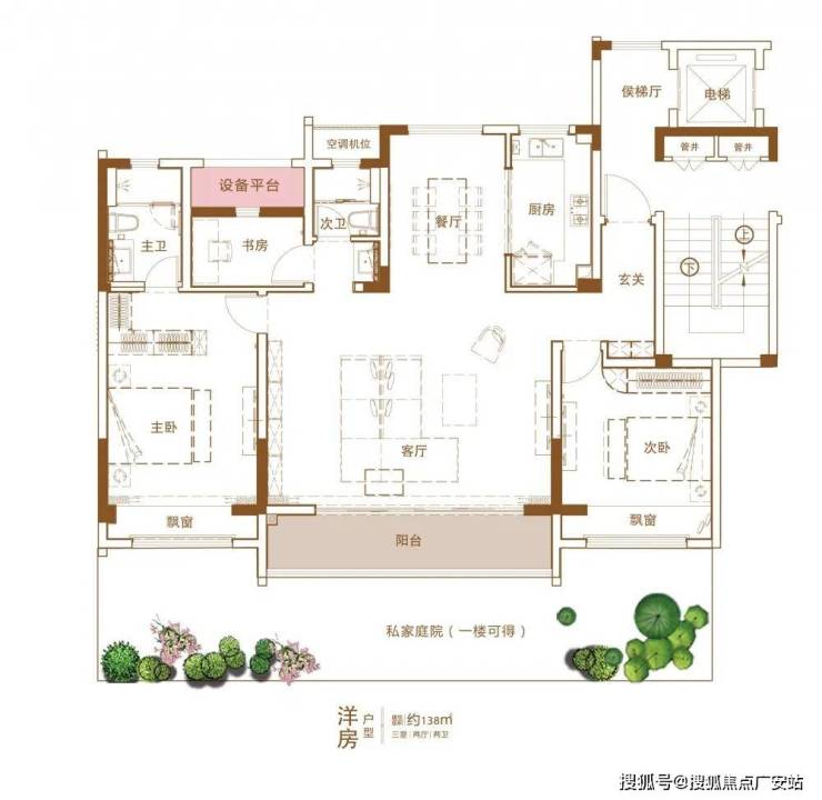 该户型一楼带有大面积庭院,无论是会友还是家庭聚餐,在庭院内都可满足。