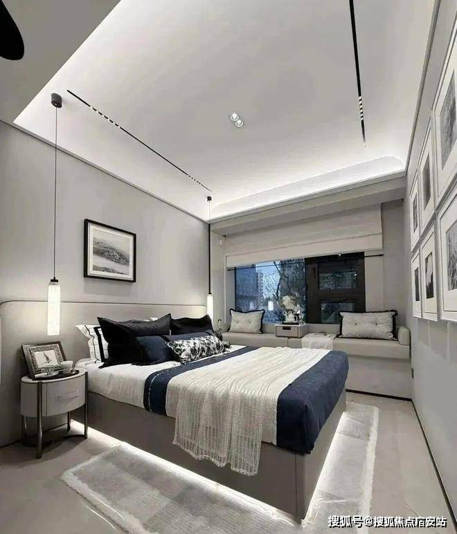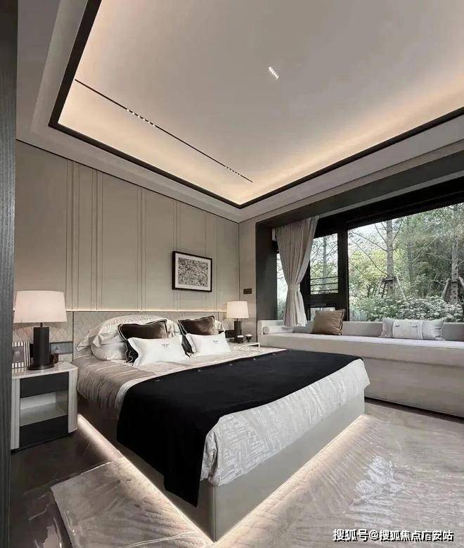 主卧转角落地窗+飘窗,也算是非常少见的了。净面宽约3.6m,不算进门的衣柜,进深大约5.7m左右。根据测算,✅✅中环置地中心望云售楼处电话:400-9692-958可以放置宽约2m的床+2个床头柜(宽度约45cm/个)是可以的。