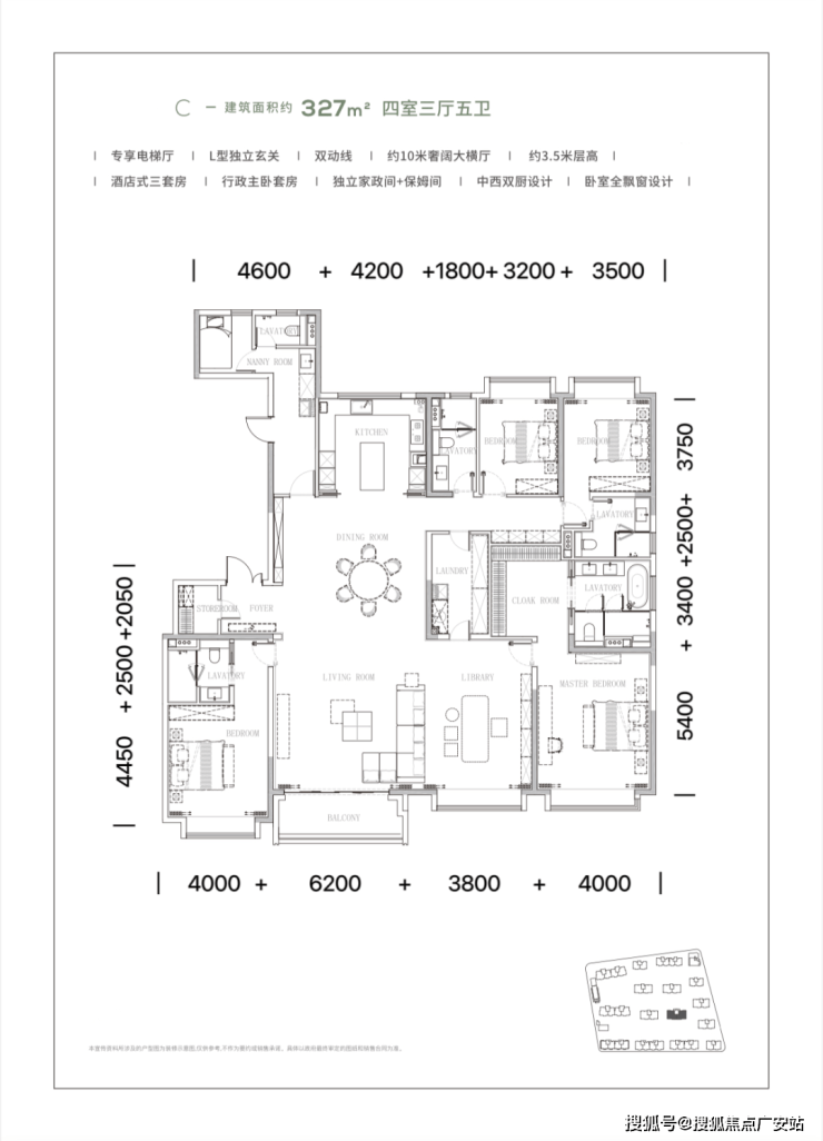 269-330㎡五房:“5+1 房” 设计,3.3-3.5 米层高,全明格局。