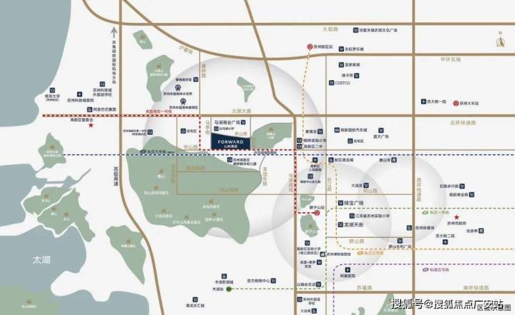 ①主城交通动脉格局:有轨电车1号线(白马涧生态园站)、轨交9号线(规划中,信息来源苏州高新发布)、何山路隧道、北环太湖大道、中环西线