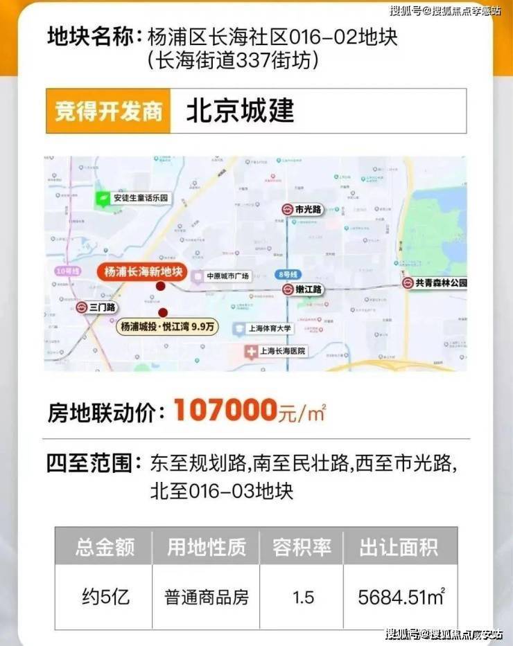 2022年7月25日,杨浦城投以20.8816亿元竞得杨浦区长海社区025-07地块(长海路街道332街坊),溢价率0%,成交楼板价50200元/㎡, 地块房地联动价99000元/㎡。城投悦江湾售楼处热线:400-9692-958📍👑👑