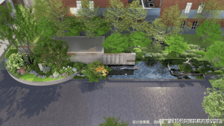 西侧通往会所的浮光庭用料非凡,景观基座选用了世贸金麻石材,植物组团+涌泉水景的应用则给社区更添活力与生机。