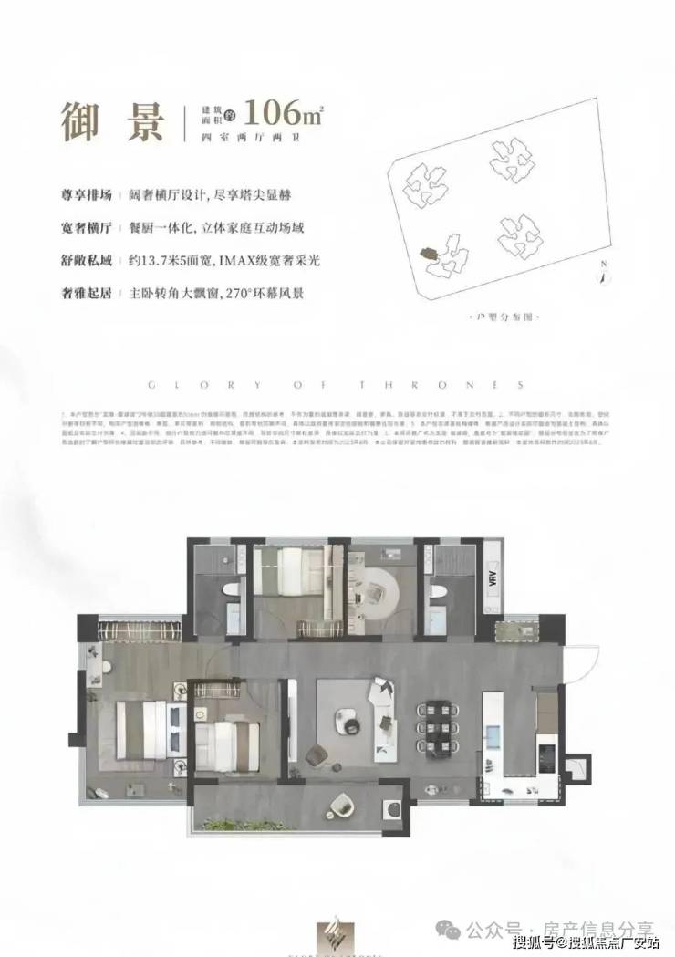 106平级产品是最具性价比的产品,四房设计,享受套房主卧,拥有120平级的连续开窗面,全屋开窗面达约13.7米,极大程度保证全屋采光通透。