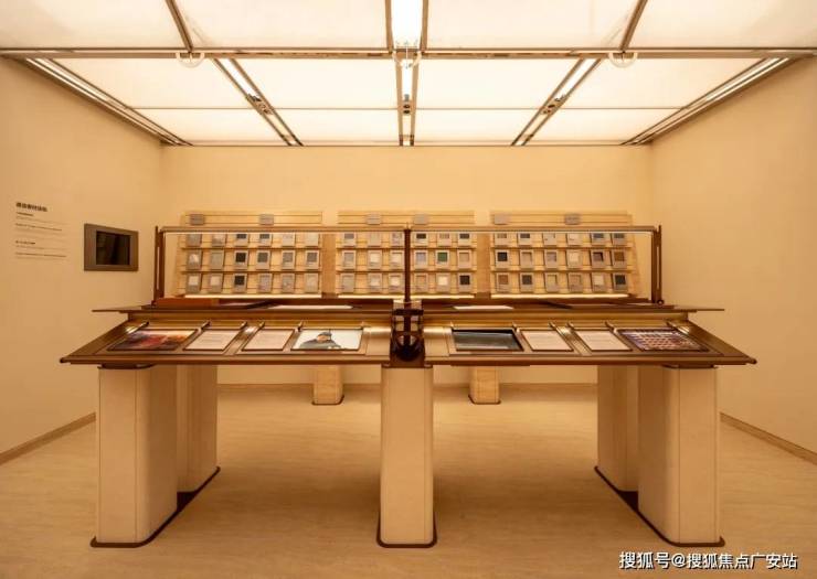 皇家白奢石、Prada绿皮革面奢石、砖纹定制铝板... 细节中透露出精致与考究。工艺工法间对72种奢材的展示,让人心悦诚服。
