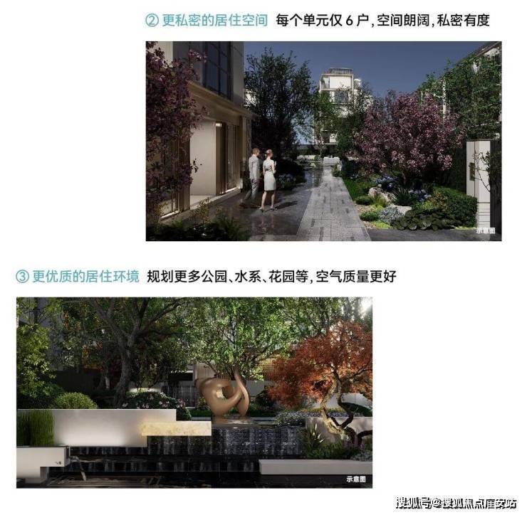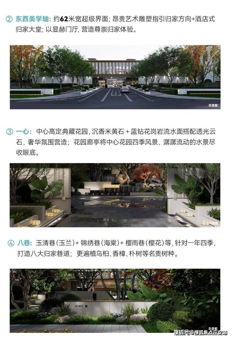 社区景观:项目内部规划“一心二轴八巷”美学空间,打造度假式归家体验,包含中央花园、四季巷道及名贵树种景观。