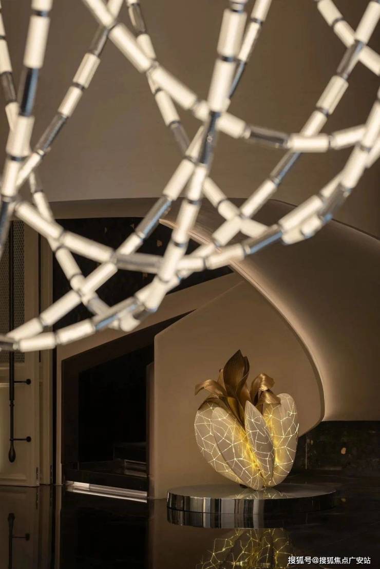 经纬交织,月映千年。绛丝工艺被应用于空间的吊灯之中,设计师力图通过非遗传统,不生硬地创建时间与空间的相对关系, 突破经典设计中对于历史的平铺直叙。