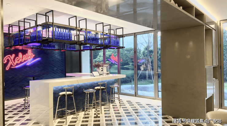 黑白交织的网格地块将“步入其中”的质感体验表达得更加生动而有韵律。入口处的吧台作为空间的基石,沉稳的翠意散发着生命力,起到承上启下的关键作用。