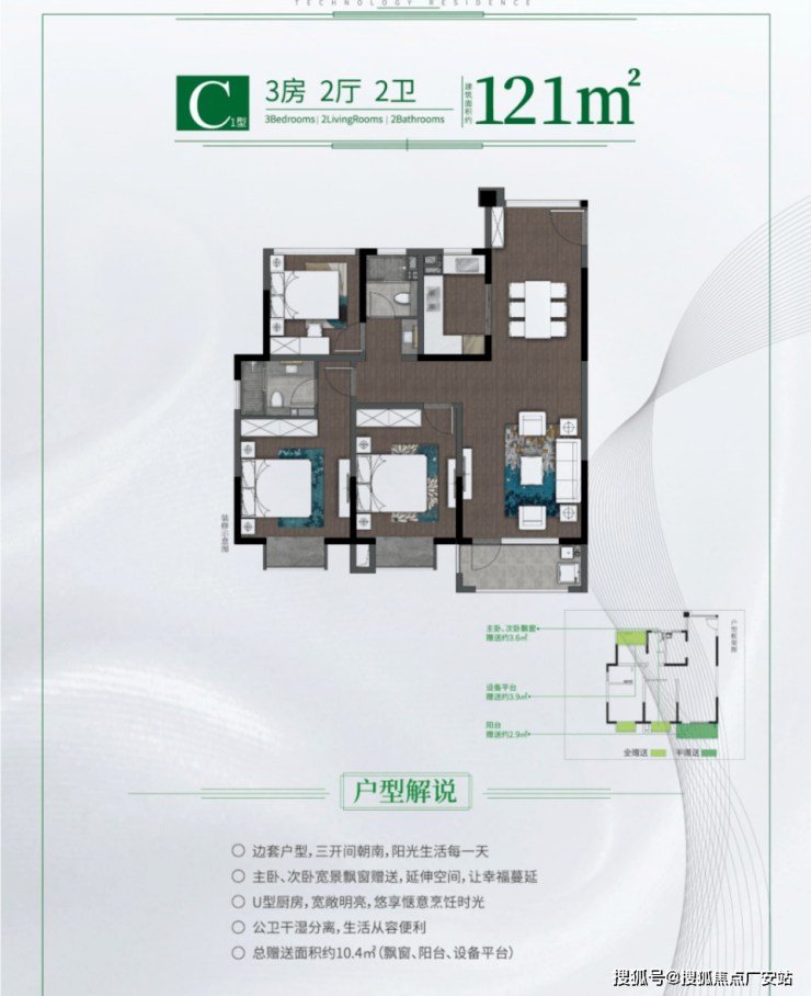 品质细节:2.95米层高,部分户型配备观景飘窗和双卫设计
