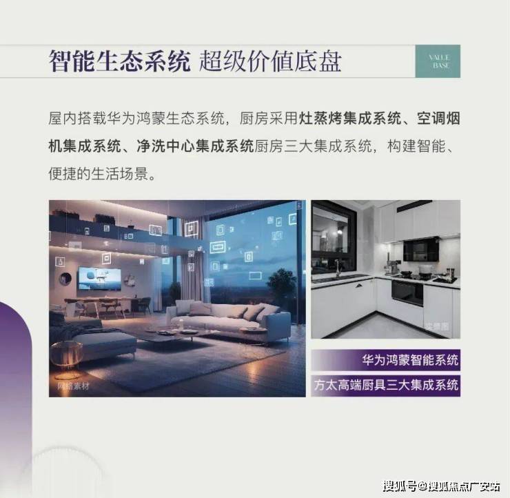 装修标准:精装交付,标准≥4000元/㎡,配备华为鸿蒙全屋智能系统、方太集成灶、博世冰箱、高仪智能卫浴等国际品牌