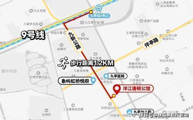 交通方面:洋江·唐顿公馆直线距离九亭站约800米,实测步行约1.2公里,是当下离地铁站较近的新盘。9号线能级超高,从九亭站出发,2站就能到七宝,5站漕河泾、8站徐家汇,甚至能直达浦东世纪大道