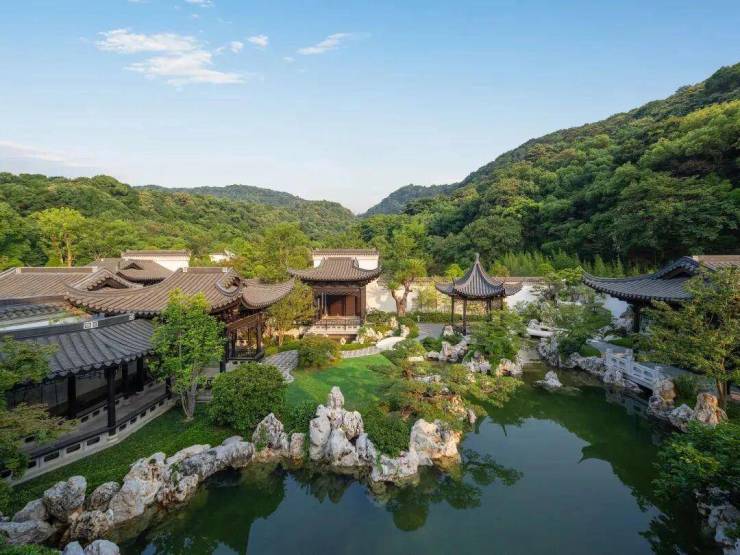 从大环境看,在约10平方公里的湘湖,这里恰好位于酒店最密集、气质最“森系”的一段。湖山天境距湖岸最近仅约100米,出门就是湘湖二期核心区,绿道、船埠、茶楼一路连缀。它落于一座蓊郁山谷,山间涓涓流下的一条溪水,在项目内汇成一潭中心湖——正是山峙水洄的风水宝地。